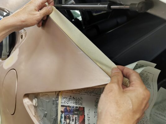 - At this point, a thorough washing is required so there are no sediments left. This is also when we cover up the parts of the car that don’t require painting in order to protect them.